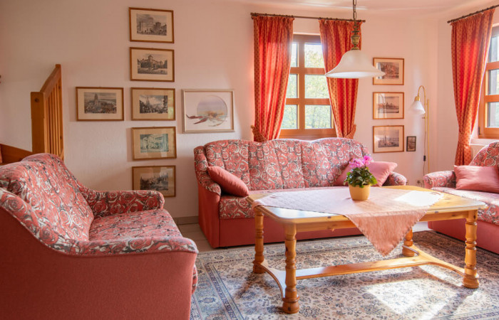 Die obere große Ferienwohnung "Flöhatalblick" erstreckt sich über zwei Geschosse. Der geräumige Wohnbereich mit einer Größe von 60 m² ist durch geschickte Möblierung in Wohnraum mit Kamin, Spieleecke und Essbereich gegliedert. Der Kamin trennt das Wohnzimmer vom Eingangsbereich und lädt Sie zum Entspannen ein. Hier können Sie es sich richtig gemütlich machen und den Alltag hinter sich lassen.